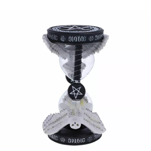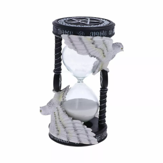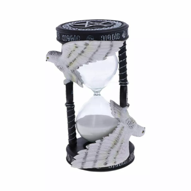 Inspired by her Awake Your Magic art which features a Snowy owl gliding through the sky grasping a pentacle pendant between its talons. The sand timer features two owls, above them is ambrigram of MAGIC which can be viewed from any direction or perspective.