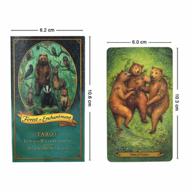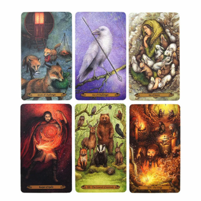 Experience the glorious enchantments of the beasts and birds, the witches and wizards, the faeries and elves. Behold the old gnarled trees, the lovely flower blossoms, and the cool energy of the deep caves. With this Rider-Waite-based deck, you will meet the magical wisdom of tarot, integrating your fate with the powerful source of subtle energy that weaves the fabric of destiny.