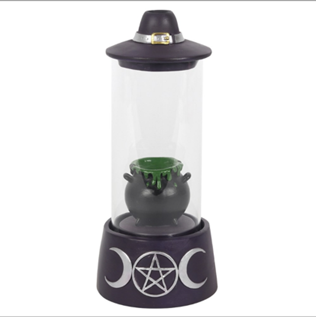 This impressive backflow cone burner is enclosed in a glass cylinder and features a bubbling cauldron, triple moon base and witch's hat lid.