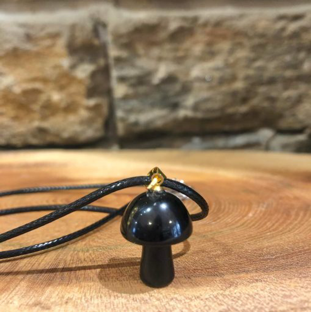 Here we have a beautiful Mushroom Necklace in a wonderful black obsidian crystal on a leather necklace with a lobster claw fastener.