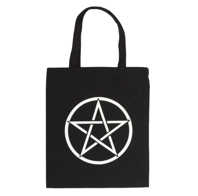Features a large pentacle printed on black. 40cm tall, not including handles.