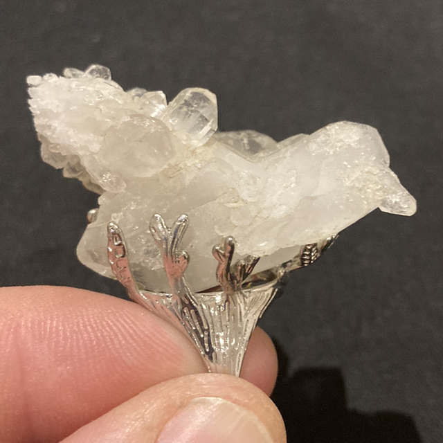 Clear quartz cluster set in a custom, fully adjustable ring base.