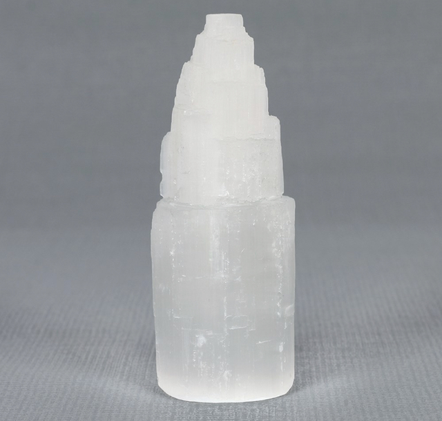 SELENITE MOUNTAIN 10cm Selenite crystal in a mountain formation which shows the beauty of the natural structure of the crystal. Also known as 'liquid light' Selenite is often used by spiritual wellness profressionals as a tool to clear negative energy and purify emotions. Dimensions H10cm x W3.5cm x D3.5c