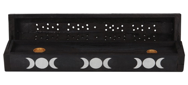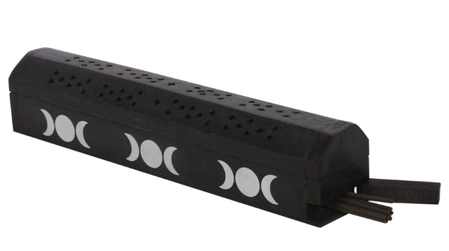 This incense gift set includes 10 sage fragranced incense sticks in a mango wood box. Printed with white triple moons, this box doubles as both an incense holder and storage.